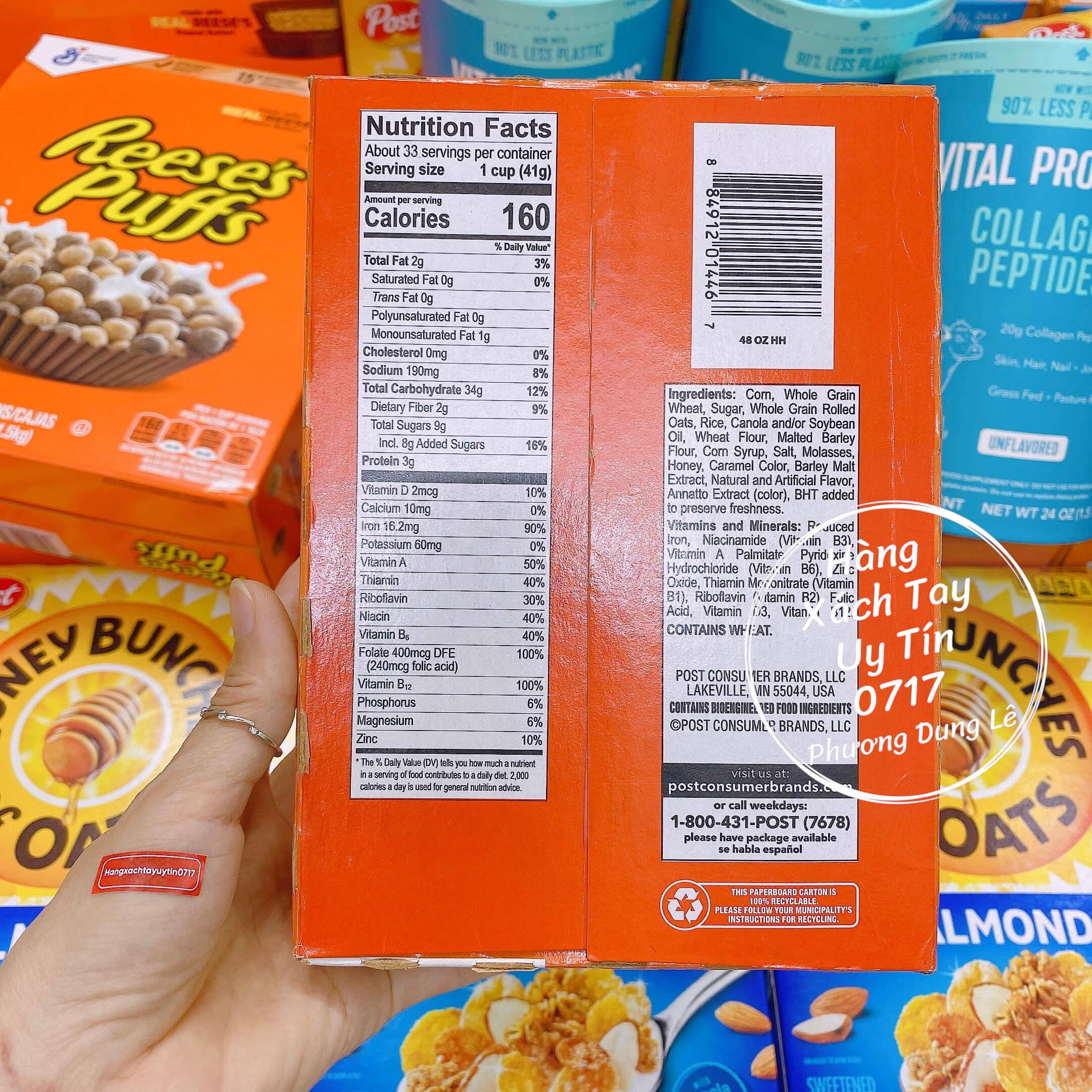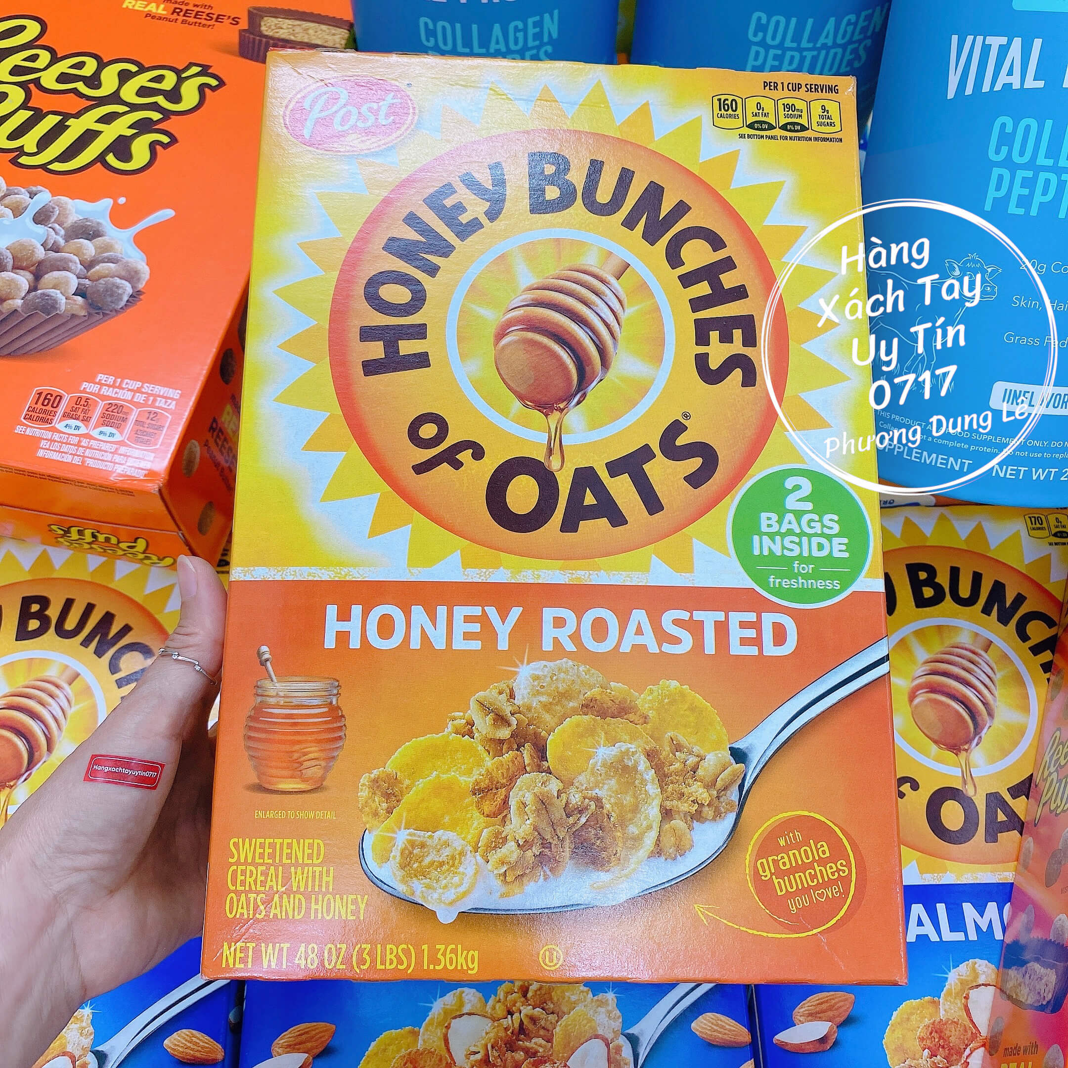 1 Hộp 1.36kg 2 túi bánh ngũ cốc yến mạch mật ong Honey Bunches of Oats Roasted Post hàng chuẩn Mỹ sweetened cereal oats honey